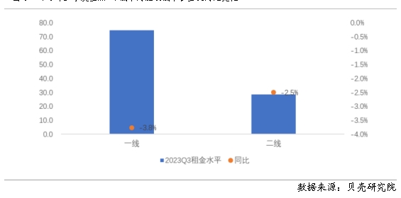 圖8 2023年三季度重點(diǎn)40城不同能級城市租金及同比變化