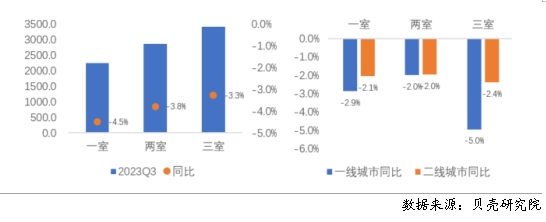 根據(jù)貝殼研究院數(shù)據(jù),全國重點(diǎn)40城中,兩居室仍然是成交主力,占比超過40%,今年三季度三居室占比首次超過了一居室,達(dá)到28.2%,其中一線城市、二線城市一居室、兩居室租賃成交占比均有不同程度的減少。一方面,由于房地產(chǎn)購房交易市場影響,延遲購房“購轉(zhuǎn)租”的租賃需求增加,這一部分多是家庭型租賃需求,家庭型租客由于考慮到父母、子女的居住需求,會更傾向于選擇大戶型。另一方面,由于保障性租賃住房、市場化集中式公寓項(xiàng)目的入市,分流了部分小戶型的租賃需求。