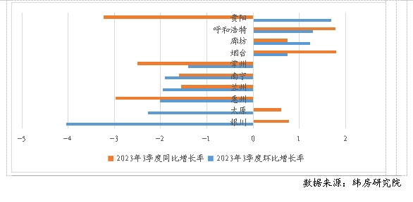 住房大數(shù)據(jù)監(jiān)測的重點(diǎn)40城中包括10個三線城市,其中4個城市三季度住房租金環(huán)比上漲,6個城市環(huán)比下降。其中,貴陽和呼和浩特環(huán)比漲幅最高,分別為1.69%和1.30%。與去年三季度末相比,5個城市住房租金低于去年同期水平,5個城市高于去年同期水平。其中,貴陽和惠州住房租金跌幅最高,分別為3.24%和2.98%;煙臺和呼和浩特漲幅最高,分別為1.8%和1.78%。