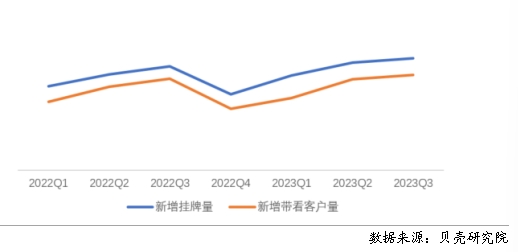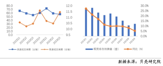 根據(jù)貝殼研究院數(shù)據(jù),全國重點(diǎn)40城三季度房客源成交周期分別為56.7、11.5天,房源成交周期環(huán)比減少2.1天,同比增加2.7天;客源成交周期環(huán)比延長1天,同比延長1天。隨著個人租賃房源供應(yīng)的增加,疊加保障性租賃住房、市場化集中式租賃房源的增加,個人業(yè)主出租房源出租速度減緩。從庫存房源來看,今年1-9月租賃庫存房源量均呈現(xiàn)同比增加的趨勢,與此同時(shí),租客租房面臨的選擇項(xiàng)增多,租客對于租賃房源可選類型和房源量均有增加。