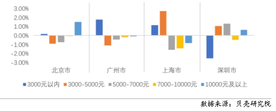 貝殼研究院數(shù)據(jù)顯示,一線城市呈現(xiàn)不同程度的重心下移,同時(shí)北京、深圳還呈現(xiàn)出延遲購房“購轉(zhuǎn)租”的特征,高套均支出區(qū)間的租賃房源成交增加。上海和廣州租賃重心下移態(tài)勢明顯。上海套均租金5000元以內(nèi)的成交占比增加了將近4個百分點(diǎn),5000元以上的占比均呈現(xiàn)減少趨勢,尤其是套均租金在5000-10000元區(qū)間的房源占比;廣州套均租金在3000元以內(nèi)的增加了1.8個百分點(diǎn),3000元以上的均呈現(xiàn)減少趨勢。
