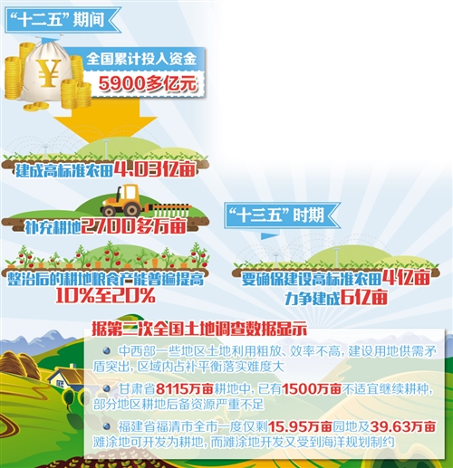 同時,對耕地的建設(shè)性保護也迫在眉睫?!敖ㄔO(shè)性保護指通過工程措施改善耕地質(zhì)量。”中央農(nóng)辦副主任韓俊介紹,近年來,國家大力推進土地整治與高標準農(nóng)田建設(shè),有效彌補了耕地產(chǎn)能損失。僅高標準農(nóng)田建設(shè)一項,“十二五”期間,全國累計投入資金5900多億元,建成高標準農(nóng)田4.03億畝,補充耕地2700多萬畝,整治后的耕地糧食產(chǎn)能普遍提高10%至20%?!笆濉睍r期,要確保建設(shè)高標準農(nóng)田4億畝,力爭建成6億畝。