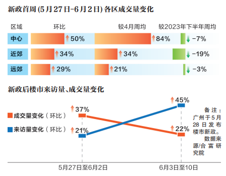 廣州“5·28”新政后,市場(chǎng)反應(yīng)確實(shí)很積極。據(jù)合富研究院監(jiān)測(cè),“5·28”新政落地,連續(xù)政策利好刺激下全市成交(基于認(rèn)購(gòu)數(shù)據(jù))階梯式上漲。5月27日至6月2日,來(lái)訪、成交環(huán)比分別上升21%、37%。各區(qū)域成交熱度均有改善,中心區(qū)域成交環(huán)比上升50%,多個(gè)熱盤如天河區(qū)越秀·觀樾,海珠區(qū)保利燕語(yǔ)堂悅、琶洲南TOD,荔灣區(qū)保利和頌等單周成交超20套。近郊、遠(yuǎn)郊成交環(huán)比分別上升34%及29%。此外,6月3日至10日,廣州樓市熱度持續(xù)活躍,來(lái)訪量比前一周上漲45%,成交量(基于認(rèn)購(gòu)規(guī)模統(tǒng)計(jì))環(huán)比上升22%;近郊黃埔、番禺來(lái)訪人氣環(huán)比均有不同程度上升,成交量比前一周上漲27%。