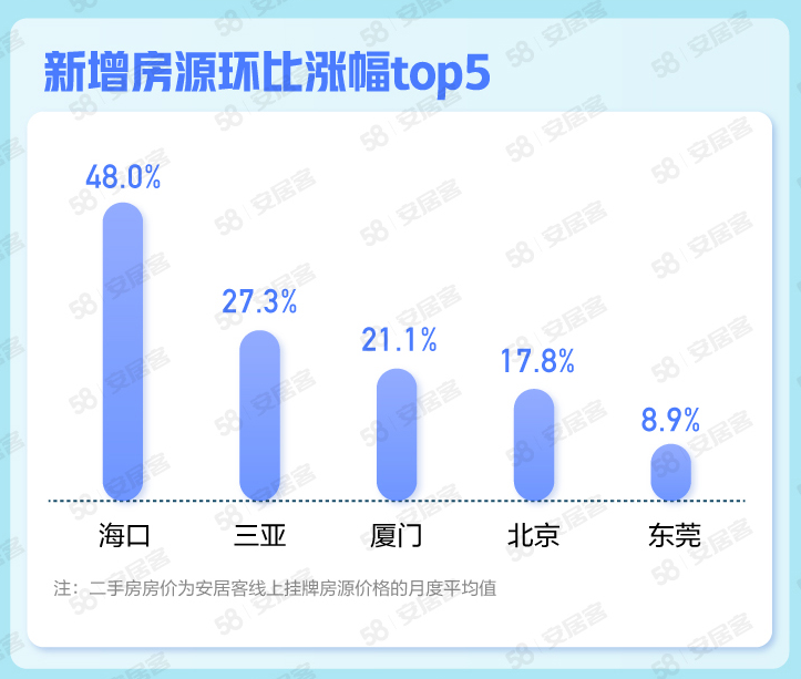 在新增供應(yīng)方面,10月全國(guó)65城新增掛牌房源量環(huán)比下跌4.1%。全國(guó)新增掛牌量房源環(huán)比上漲的前三名城市分別是??凇⑷齺?、廈門,分別上漲48%、27.3%、21.1%。