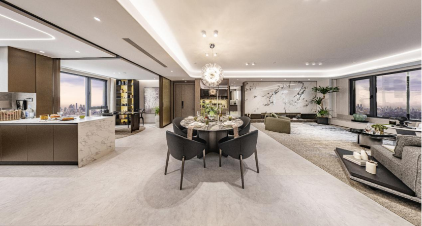 北熙區(qū)170平方米的四室兩廳兩衛(wèi)戶型則采用了現(xiàn)代簡約的設計風格,摒棄繁復裝飾,使用精選皮革、藝術玻璃、古銅不銹鋼等現(xiàn)代材質匹配大尺度橫向空間,塑造質感美學空間。整體格局規(guī)整,南向面寬達13.85米,且設計了通透、多變的客廳空間,既能與廚房聯(lián)通,也可與書房互動,可以是朋友們的歡聚場,也可以是靜享品茗、閱讀美好時光的生活場。主臥套房酒店式設計,獨立衣帽間、獨立衛(wèi)浴,彰顯居者的居住尺度。