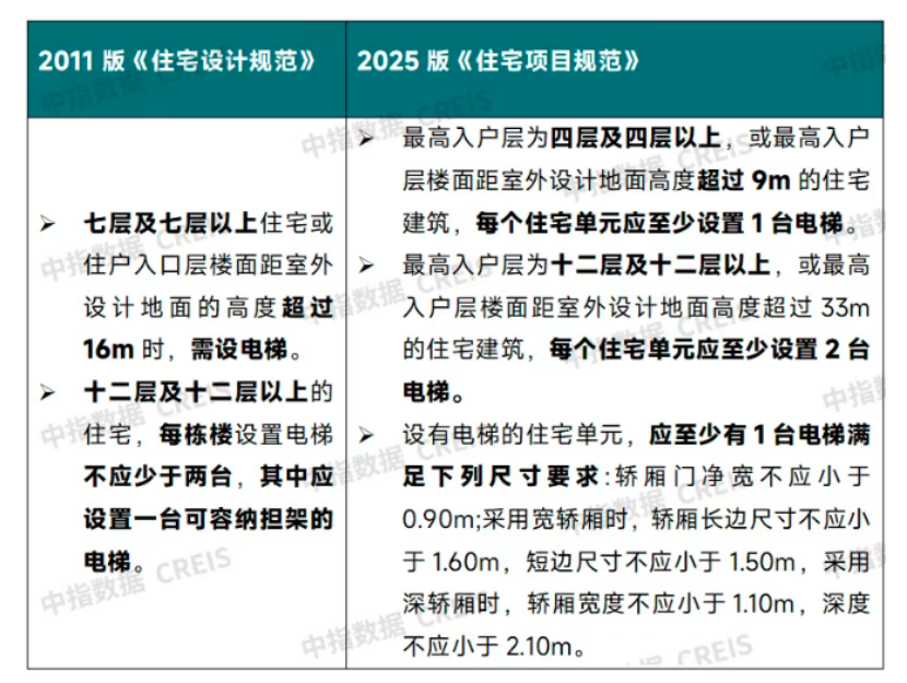 電梯設(shè)置方面,新版《住宅項目規(guī)范》降低了電梯設(shè)置的樓層要求,從原規(guī)定“七層及以上需設(shè)電梯”調(diào)整為“四層及以上需設(shè)電梯”。