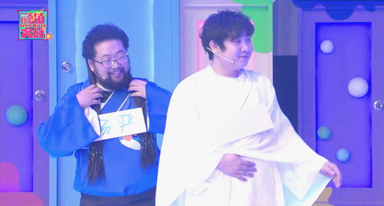一開場兩人被發(fā)糖——“選妃”可抱美人歸。遮擋住臉龐的各位“妃子”穿著古風裙,俏麗非凡的樣子讓兩位嘉賓欣喜不已,想著總算可以和漂亮的姑娘們搭檔了,誰料半路殺出王守英,頭戴瓜子身披綠紗,一身自制衣服就劫走了喬杉,看著這二人配對成功,修睿還做著自己會和小美女搭檔的美夢,然而張大大直接判決,修睿配對小甜甜。
