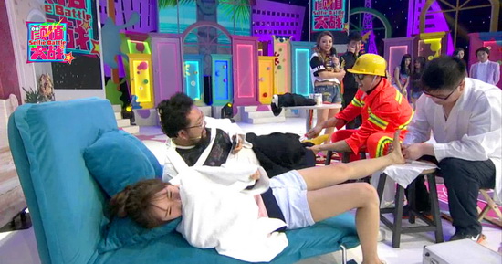 更悲慘的還在后面等著修睿。原地做造型自拍都困難無比,身子完全掌握不到平衡,直接踹翻道具椅,颶風碉堡更是變成一座阻擋他前進的大山,一步兩步往前跳,努力自拍擺造型,無奈實在抵擋不住勁風,直接單膝跪地整個人撲倒。和美女體驗情景自拍,抽到“撲倒與被撲倒”,被搭檔嫌棄還要忍受撓腳心的煎熬,拍出驚悚照被張大大、小甜甜一陣暴風吐槽。而喬杉則和一貫的老搭檔小甜甜再度演繹情景,兩人同吃小香腸自拍,一邊喬杉被撓腳心哭笑不得,氣得搶下按摩器直敲“按摩師”。