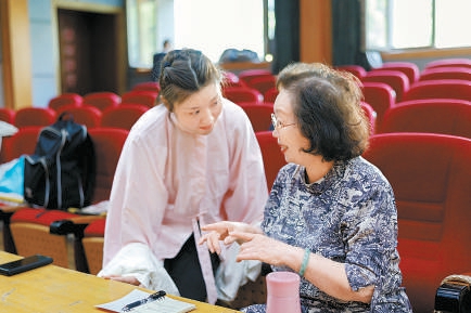 京劇表演藝術家閻桂祥(右)為陳張霞親授《白蛇傳》。蘇巖攝