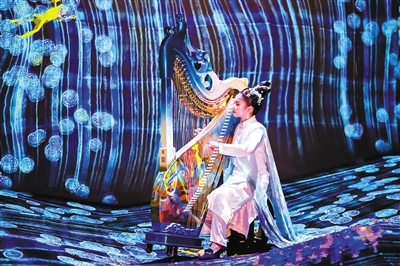 以往的音樂(lè)會(huì)中,觀眾是在固定位置坐著聽(tīng),而在沉浸音樂(lè)會(huì)《只此一夢(mèng)》上,現(xiàn)場(chǎng)的觀眾跟隨著指引不斷行進(jìn),從而開(kāi)啟了一種新的聽(tīng)音樂(lè)和逛展覽的模式。例如,《無(wú)窮無(wú)盡的水晶宇宙》本來(lái)就是北京teamLab無(wú)相藝術(shù)空間的網(wǎng)紅打卡點(diǎn),如水晶雨滴一般的視覺(jué)呈現(xiàn),配合琵琶叮咚如玉珠散落水晶盤中,竹笛聲悠揚(yáng)似鷓鴣穿飛瓊林苑里,正是玉樹(shù)瓊枝點(diǎn)點(diǎn)鳥,珠花盛開(kāi)鷓鴣飛!《只此一夢(mèng)》沉浸音樂(lè)會(huì)是可以聽(tīng)的畫面,是可以看的音符,觀眾與樂(lè)手可謂“零距離”。