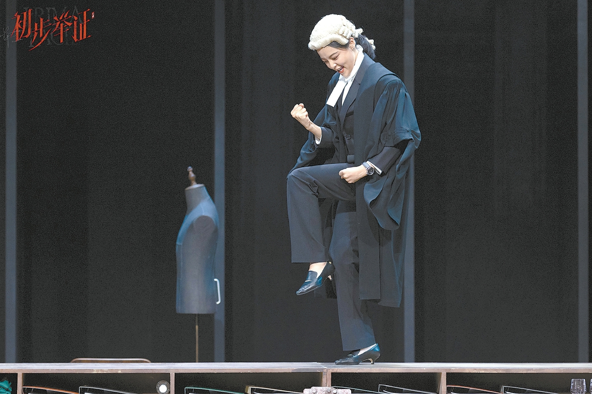 舞臺極為對稱。最醒目的,是兩側微微斜切向后景的賽馬欄。如果從上方俯視,賽馬欄將舞臺空間變成了一個等邊梯形,中央橫放著長長的組合式開架矮桌柜。這是由蘇西·米勒編劇、周可導演的獨角戲《初步舉證》中文版的現(xiàn)場。從大空間布局上看,中文版與2022年4月英國NTlive版有一定相似性。但舞臺布景的差異,還是顯示出導演不同的側重點。NTlive版以三面巨大的、裝滿卷宗的書柜構成了半包圍式舞臺結構,舞臺中央是兩張大辦公桌。這一偏于寫實的布景突出了主角的律師身份,既富專業(yè)性,又有無形的壓迫感。中文版的賽馬欄則暗示庭辯仿佛賽馬,突出了律師爭當“第一名”的渴望。從觀眾席望去,對稱的舞臺呈現(xiàn)出一種均衡和穩(wěn)定。演出開始后,伴隨有轉臺功能的矮桌柜的一次次旋轉,主人公以她失衡的人生告訴觀眾:有些事情必須改變。