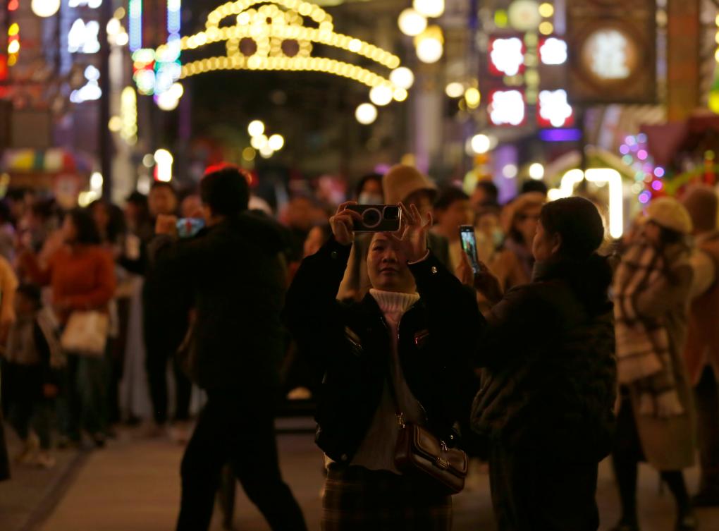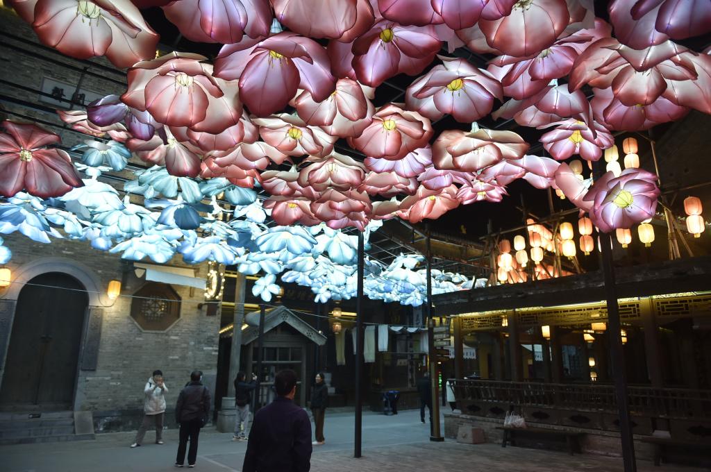 11月16日晚,游人在建業(yè)電影小鎮(zhèn)內(nèi)游覽拍照。新華社記者 戴翹楚 攝 位于河南省中牟縣的建業(yè)電影小鎮(zhèn)以電影主題演藝為核心,打造集電影互動游樂、電影文化體驗、電影主題客棧、民俗和非遺體驗等內(nèi)容于一體的沉浸式文旅項目。夜晚時分,游人在小鎮(zhèn)中穿梭游覽,觀賞各類實景演出,體驗妙趣橫生的電影情境之旅。