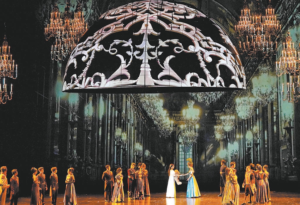 與壯闊宏大的作品立意相匹配的,是當?shù)闷鹑A美二字的舞臺呈現(xiàn)。璀璨的吊燈、長長的樓梯等鮮明意象不斷出現(xiàn),簡潔的布景與流動的影像虛實交織,把輝煌的宮廷、幽靜的鄉(xiāng)村、無垠的星空等場景營造得深邃動人。其中,由多塊LED屏拼成的圓弧最引人注目,在舞美設計維亞切斯拉夫·奧庫涅夫的解讀中,和平的寧靜短暫降臨時,圓弧可以隨影像變幻為宮殿穹頂、簡潔的花園涼亭,為生活遮風擋雨;戰(zhàn)爭襲來,刺目的紅光從破裂崩碎的圓弧中迸濺而出,恰如滿目瘡痍、生靈涂炭的現(xiàn)實。最終,幾瓣圓弧拼成碧水青山的“地球”,呼應原著小說標題中的俄語單詞“Mip”,即“世界”,將作品的意境再次推上新的高點。