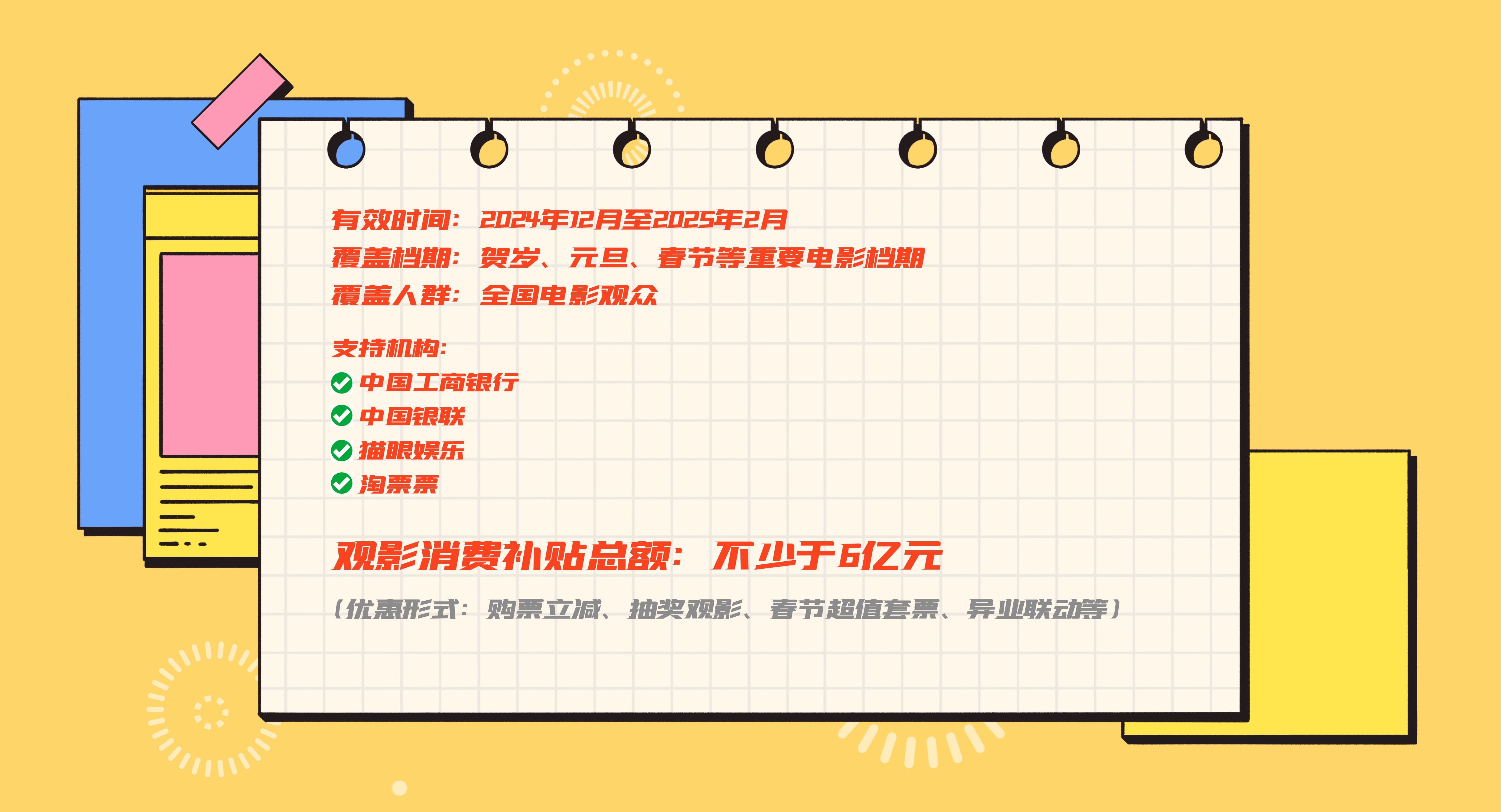 還有個好消息 觀影消費補(bǔ)貼來啦! 去年12月 國家電影局啟動了 “跨年賀歲 喜迎新春——全國電影惠民消費季” 合計投入不少于6億元觀影消費補(bǔ)貼 惠及全國電影觀眾