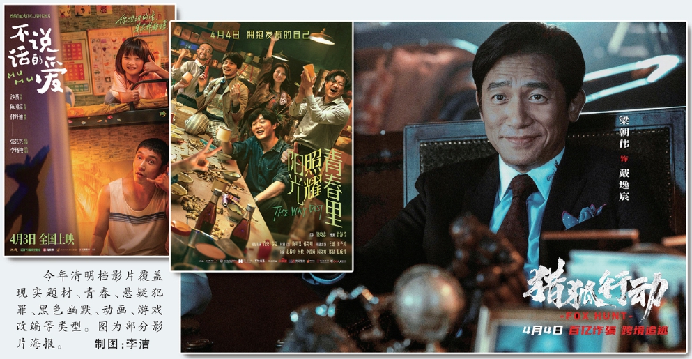 今年清明檔影片覆蓋現實題材、青春、懸疑犯罪、黑色幽默、動畫、游戲改編等類型。圖為部分影片海報。 制圖:李潔 春暖花開,清明檔電影市場蓄勢待發(fā)。燈塔專業(yè)版顯示,截至昨晚,已有17部影片定檔在4月2日至4日。 相對春節(jié)檔、暑期檔、國慶檔等黃金強檔,清明檔是“小”的,3天時間可能尚不足以完全釋放市場能量。但這兩年,“小檔期”屢屢刷新市場認知。2021年8.22億元、2024年8.42億元的票房成績都證明了,檔期之大小,并不絕對取決于強視效大片的濃度,只要能喚起真切的共情共鳴,觀眾就愿意走進電影院消費。與此同時,上海市電影局聯合淘票票、貓眼推出了新一輪總價值4500萬元“樂影上海”電影消費券,政企聯手助力消費。 從目前的檔期片單來看,影片供給充足,覆蓋現實題材、青春、懸疑犯罪、黑色幽默、動畫、游戲改編等多元類型、不同體量;主創(chuàng)陣容里不乏梁朝偉、段奕宏、趙麗穎、張藝興、肖央等頗有票房號召力的演員。今年的清明檔能否再次激發(fā)觀眾的觀影熱情,我們期待好故事給出答案。 人文關懷:讓電影催動現實的能量 如果檔期有性格屬性,清明檔大約是最具人文關懷的之一。踏青出游、慎終追遠的假期里,人們似乎更愿意聆聽那些有關生命真諦的事。今年,多部影片關注特殊群體,試圖引發(fā)觀眾對人性與社會的思考,展現電影對社會議題的深度探索與藝術表達的創(chuàng)新嘗試。 截至30日中午,影片《不說話的愛》預售票房率先突破千萬元,領跑檔期。該片由青年導演沙漠執(zhí)導,講述了聾人父親小馬與聽人女兒木木在無聲世界里雙向守護的故事。難得的是,影片試圖在片場內外都構建起跨越有聲與無聲世界的對話橋梁。故事里,導演的表達不只停留在親情敘事層面。小馬為給孩子更好的生活,不幸被騙入歧途,陷入道德困境,這樣的犯罪情節(jié)既有商業(yè)片的框架,也從另一個維度探究聽障群體的生活處境,實現了社會性?,F實中,影片邀請近30位聾人演員參演,主演張藝興也潛心學習手語、全程零臺詞演繹。從昨天的限時點映口碑來看,新片情感細膩,催淚但不喪。 《向陽·花》尚未開啟預售,但影片自官宣以來始終熱度居高。馮小剛導演、趙麗穎領銜主演的陣容固然是個中緣由,更關鍵的恐怕還是小眾題材。電影將鏡頭對準女性刑滿釋放人員,追蹤她們在回歸社會過程中面臨的道德審判、生存壓力、情感掙扎。此前,導演曾表示,影片著力通過這些角色從“社會邊緣人”到“自我救贖者”的蛻變,展現女性在絕境中迸發(fā)的生命力。 《特別的你》作為中國首部孤獨癥群體紀錄電影,將在4月2日“世界孤獨癥日”公映。影片聚焦三個孤獨癥孩子,通過真實影像照見孤獨癥人士及其家庭的日常:12歲的程瑞有繪畫天賦,但溝通能力欠缺,情緒不定;15歲的可可已經擁有了成年人的外形體格,但仍缺乏足夠的生活自理能力;19歲的王浚力有著相對健全的語言溝通和獨立生活能力,但最讓母親掛懷的還是讓他找份工作,有機會自食其力。影片在上海的超前首映式上,導演翁羽說,全國有1400萬孤獨癥患者,這背后就是1400萬個終身需要陪護的人,他希望通過《特別的你》讓更多人了解孤獨癥群體。 《陽光照耀青春里》由曾海若導演,以黑色幽默探討精神康復院里的身份困境。肖央飾演的游戲開發(fā)程序員,與春夏、陳明昊、蔣奇明等出演的特殊群體群像,如何在啼笑皆非的故事里碰撞出普通人內心的秘密,將成為影片一大看點。在監(jiān)制饒曉志看來,每個靈魂都渴望被看見,影片希望用尊重和理解的視角展現特殊群體,“希望呈現的不是苦難,而是‘青春里’這些人本真的那一面”。 這些影片如同一面面鏡子,映照出容易被忽視的角落。就像翁羽說的,“電影創(chuàng)作者關注特殊群體,與其說是‘拯救’,不如說是‘被拯救’,是每一個加倍熱愛生活的他們,讓我看到了自己拍電影的意義”,電影的價值不僅在于呈現,也在于以藝術的力量重構人們對“他者”的理解,激發(fā)社會的關注和行動。 細分賽道:等待黑馬破局 如果說關注普遍人性、具有人文關懷的電影能網羅不同年齡、不同喜好的觀眾,那么在數字文娛消費重塑電影市場的今天,細分賽道越來越值得關注。 海外追逃犯罪大片《獵狐行動》由梁朝偉與段奕宏領銜主演,可謂傳統(tǒng)警匪片愛好者的硬核福利。片中,潛逃七年的上海百億金融詐騙案主犯戴逸宸現身巴黎,聞訊而動的經偵警探葉鈞率“獵狐小隊”展開跨國追緝,起底174億百姓血汗錢一夜蒸發(fā)背后的驚天內幕。影片取材自中國公安機關跨國追逃真實案例,主創(chuàng)曾耗時三年走訪北京、上海以及巴黎、諾曼底等地實景拍攝。 引進片賽道里,這個清明檔有兩部新片與觀眾見面,兩部都帶有鮮明的粉絲屬性。好萊塢真人奇幻冒險片《我的世界大電影》改編自知名沙盒游戲《我的世界》。該游戲全球累計銷量超過3億份,躋身電子游戲歷史銷量榜前十。龐大的游戲粉絲群、覆蓋全球范圍的IP效應,都為游戲改編電影帶來了固定客群?!段业氖澜绱箅娪啊放c2023年清明檔上映的《超級馬力歐兄弟大電影》境況相似,都是基于游戲改編的電影,且都選擇與北美同步上映。從票房表現來看,《超級馬力歐兄弟大電影》全球票房高達13.6億美元,位列全球影史票房榜第18位,但在中國內地市場僅獲得了2366.5萬美
