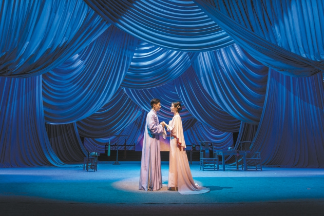 近日,北京人民藝術劇院再次排演該劇,以意象化手段賦予劇中男女主人公的愛情以詩意——不但在兩人交談時加入了許多戲曲身段,更加入了新的臺詞強化兩人的愛慕之情;結(jié)尾以一段雙人舞展現(xiàn)兩個自由的靈魂在虛空中的相會;不時出現(xiàn)的昆曲《牡丹亭》作為背景音樂,昭示兩人超越生死的愛戀。
