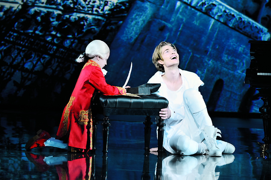 《莫扎特!》里的“另一個(gè)自我”卻不一樣,這個(gè)默默的小莫扎特既貫穿始終,又十分乖巧,基本上不去打擾主人公,絲毫不在聲音上影響這部歌曲極密的音樂劇的呈現(xiàn),卻能給觀眾留下更難以磨滅的印象?!澳男∧亍北緛砜赡苤皇侵鲃?chuàng)不得已采用的辦法,因?yàn)閮和輪T不大可能每晚演出,經(jīng)常要換人——上海的演出就是請(qǐng)了上海的孩子,很難要他們說或唱復(fù)雜的臺(tái)詞和唱段,所以干脆讓他們演啞劇。這個(gè)辦法似乎歪打正著,反而產(chǎn)生了舞臺(tái)上最好的效果。