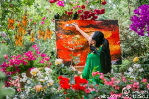 13日,舞蹈家楊麗萍在微博曬出一組自己在花園中作畫的照片。只見楊麗萍民族風(fēng)裝扮,而她所在的周圍鮮花滿布,姹紫嫣紅,還不時地有幾只鳥落在身旁,好似人間仙境。