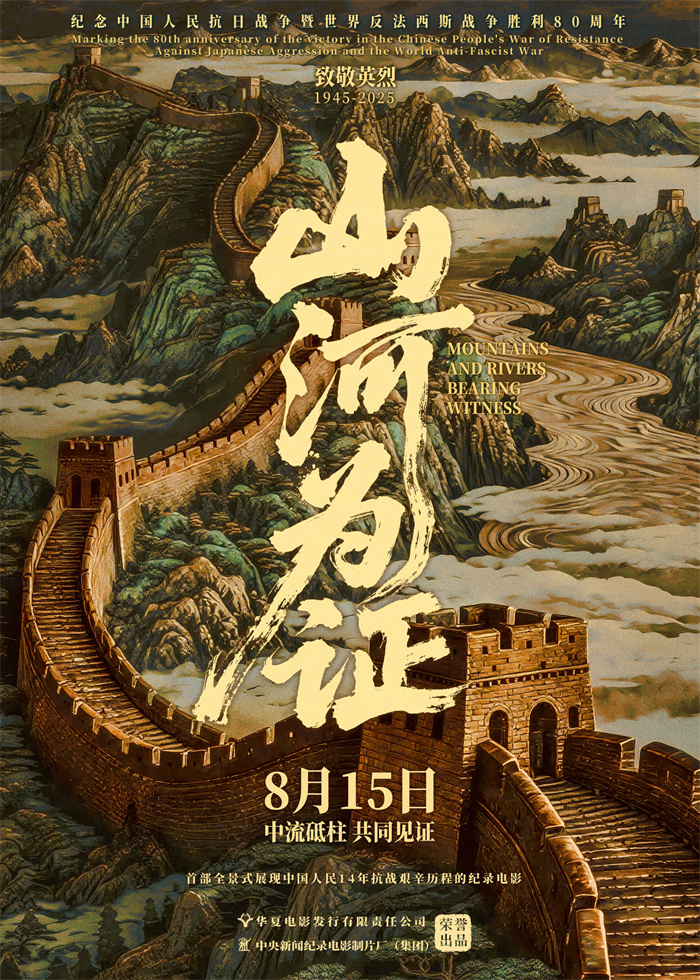 在紀(jì)念中國人民抗日戰(zhàn)爭(zhēng)暨世界反法西斯戰(zhàn)爭(zhēng)勝利80周年的重要?dú)v史時(shí)刻,紀(jì)錄電影《山河為證》正式宣布定檔,將于2025年8月15日登陸全國院線。影片由華夏電影發(fā)行有限責(zé)任公司與中央新聞紀(jì)錄電影制片廠(集團(tuán))出品,同步發(fā)布定檔版海報(bào)。