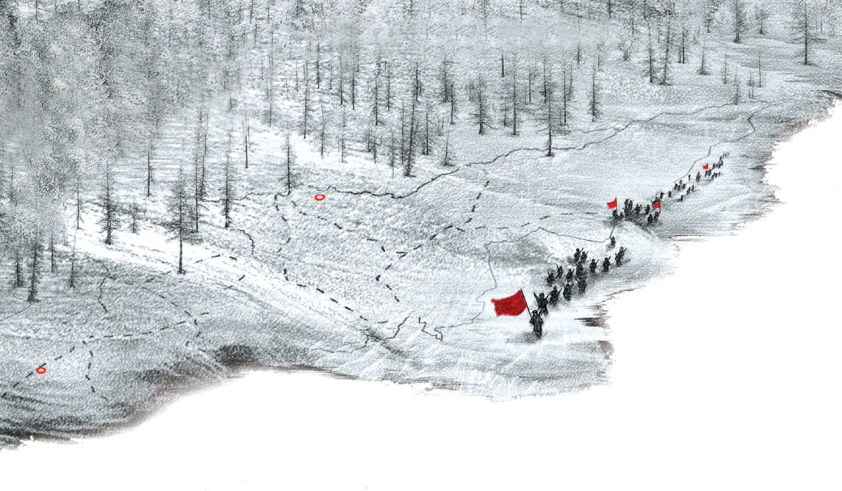 每年很長時(shí)間,這里的氣候不適合室外生存,冬季氣溫更低至零下三四十度,有人的耳朵、手指、腳趾甚至?xí)粌龅?。日軍將?dāng)?shù)卮迕駨?qiáng)制集中居住,抗聯(lián)得不到食物、衣服等。正如《歸隊(duì)》中所呈現(xiàn)出來的那樣:戰(zhàn)士們輕易不能生火取暖,深可沒腰的積雪限制了我方移動,行蹤又很容易被發(fā)現(xiàn)——敵人會沿著雪地上的腳印,進(jìn)行追擊。