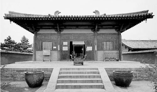 南禪寺位于山西五臺縣城西南22公里李家莊西側(cè)。坐北向南,有山門、龍王殿、菩薩殿和大佛殿等主要建筑,圍成一個四合院形式。創(chuàng)建年代不詳,大殿平梁下保存有墨書題記,足證重建于唐建中三年(782)。晚唐時武宗“會昌滅法”幸免毀壞,是我國現(xiàn)存最古的唐代木構(gòu)建筑。大殿面寬進深各三間,單檐歇山式屋頂,殿前有寬敞的月臺,柱上安有雄健的斗拱,承托屋檐,殿內(nèi)無柱,四椽桴通達前后檐柱之外,梁架結(jié)構(gòu)簡練,屋頂舉折平緩。說明我國唐代建筑技術(shù)已有很高水平,而且已普及到偏僻山村。