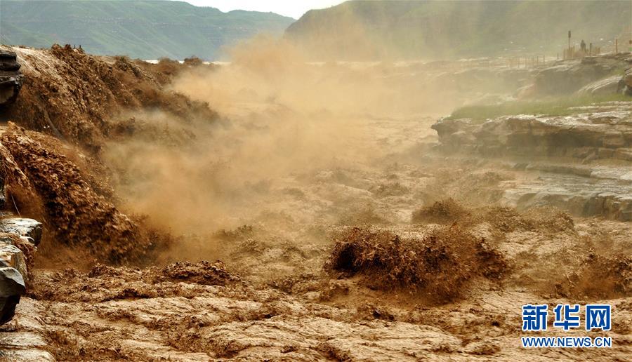 受上游強(qiáng)降雨影響,黃河壺口瀑布水勢(shì)大漲,主副瀑布連成一片。