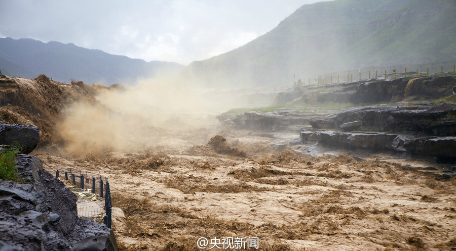 受上游強降雨和水庫放水影響,最近幾天,黃河壺口瀑布迎來伏汛,最大水流量達(dá)到每秒2600立方米左右,濁流滾滾奔騰而下,氣勢磅礴?。ㄑ胍曈浾呃钪?文豪)