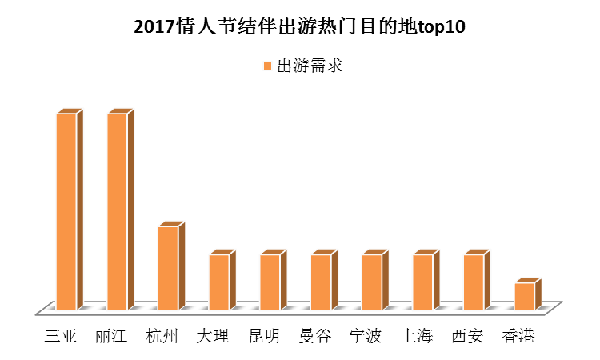 同程旅游對今年情人節(jié)當天情侶們及單身男女的旅游消費及出行數(shù)據(jù)進行了系統(tǒng)分析?!秷蟾妗窋?shù)據(jù)顯示,情人節(jié)恰逢春節(jié)后錯峰出游的好機會,國內(nèi)旅游最受歡迎的目的地主要有三亞、廈門、桂林、昆明、麗江、上海、杭州、揚州、北海、成都等。出境游方面,日本、韓國、泰國、澳大利亞、新加坡等。