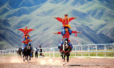 甘肅省肅南縣搶抓“一帶一路”機遇,打造全域旅游“自然生態(tài)博物館”,進一步弘揚民族傳統(tǒng)文化,展示當(dāng)?shù)貪庥舻拿褡屣L(fēng)情和獨特的自然景觀,促進當(dāng)?shù)芈糜挝幕w育融合發(fā)展。圖為賽馬選手在肅南縣日前舉辦的索朗格國際賽馬場進行馬術(shù)表演。