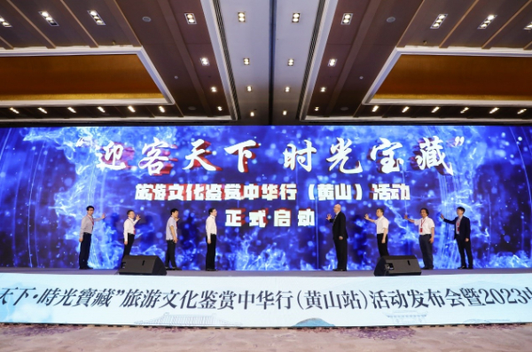 大會最后,八位嘉賓共同上臺按下啟動按鈕,宣布“迎客天下 時(shí)光寶藏——旅游文化鑒賞中華行(黃山)活動”正式啟動。