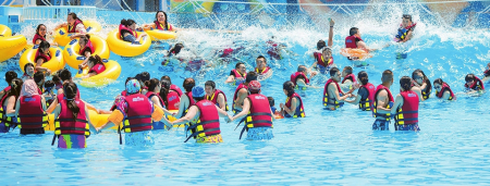 走進(jìn)精衛(wèi)水世界,陽(yáng)光、椰林、沙灘,以及南方綠色植物景觀和卡通造型,讓人仿佛置身空氣清新、陽(yáng)光明媚的海邊城市。這里可以體驗(yàn)以海浪海嘯為主題的探險(xiǎn),在大喇叭、彩虹滑梯、大型水寨等水上娛樂項(xiàng)目間穿梭嬉戲,感受水世界的無(wú)限清涼。在冒險(xiǎn)廣場(chǎng),最刺激的和好玩的都在這里——大擺錘、魔法過(guò)山車、旋轉(zhuǎn)杯、海盜船、高空飛行、旋轉(zhuǎn)木馬、碰碰車、蹦極、火箭蹦極、尖叫、飛鷹、探空飛梭……光是聽到游客的尖叫聲,就令人興奮起來(lái)。特別是勇者無(wú)懼的蹦極,看似放棄一切的縱身一躍,竟也是將自己心靈放空所尋求的“涅槃”。