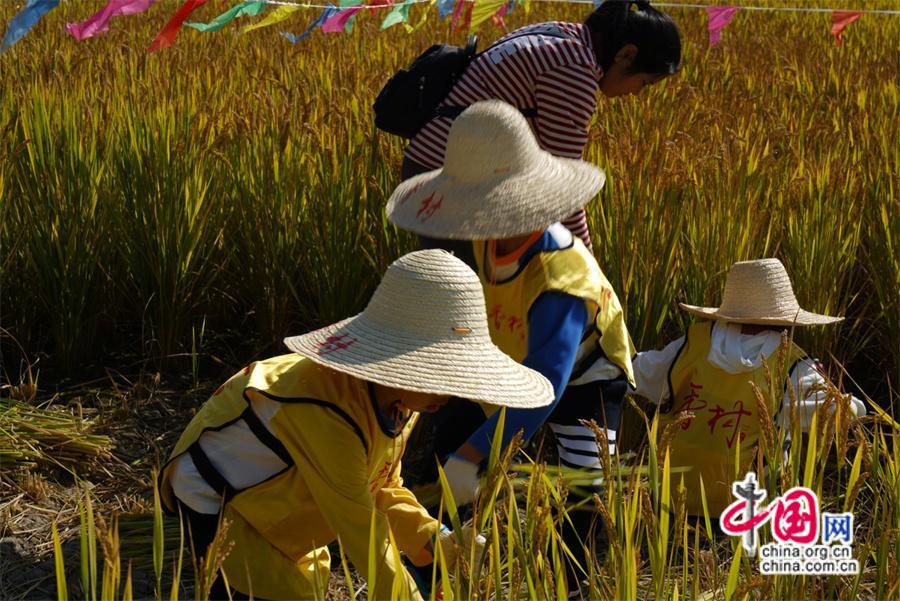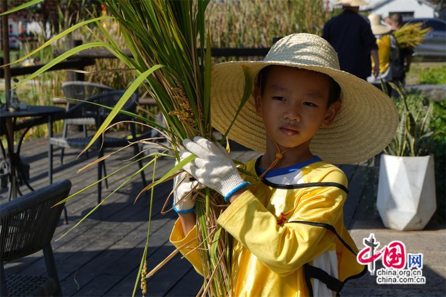 恰逢周末,清晨的陽(yáng)光灑滿田野,又是一個(gè)舒適的好晴天,“這邊,這邊集合啦”在香村的小廣場(chǎng)上,一場(chǎng)“割稻子”的體驗(yàn)活動(dòng)即將開始,周末到香村度假體驗(yàn)農(nóng)耕文化的游客越來(lái)愈多,不僅因?yàn)橄愦宓拿?,更因?yàn)樵谙愦宕笕诵『⒍伎梢詤⑴c到農(nóng)事活動(dòng)中,還能帶走勞動(dòng)收獲。