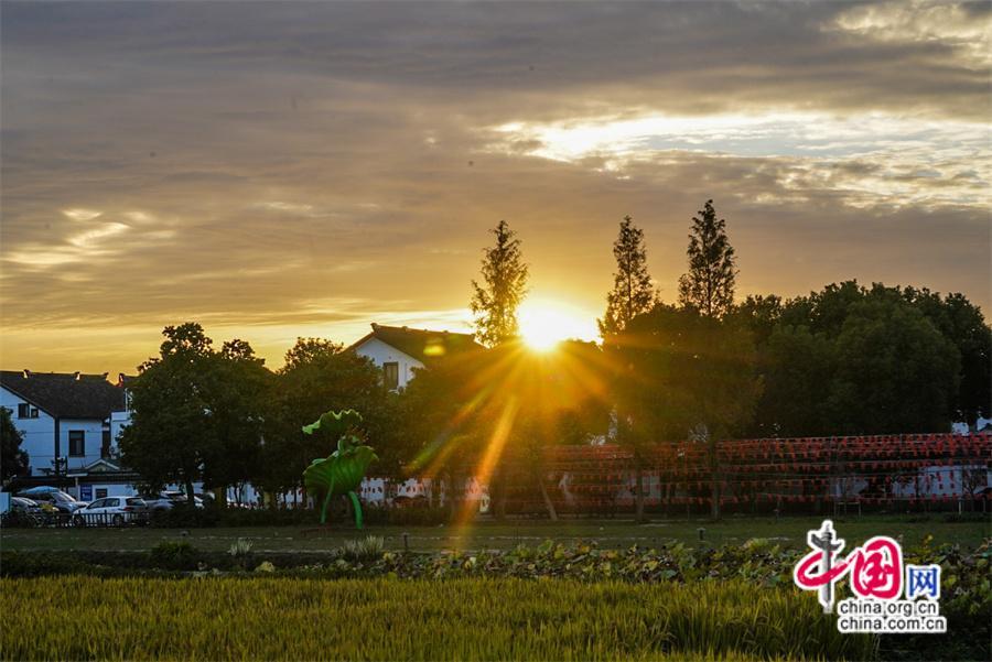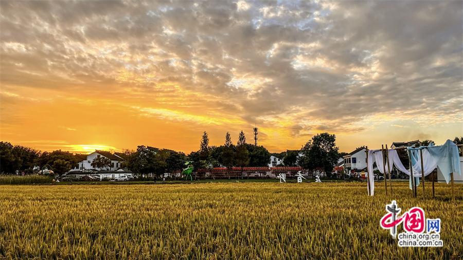 傍晚時(shí)分抵達(dá)香村,收獲了一場(chǎng)驚艷的落日美景,云層色彩在光線折射下不斷變化,忽而紅如火,忽而燦如金,忽而粉如煙,再到最后一抹落日的余暉撒遍整個(gè)村莊,稻田村舍,樹木小花,一切都籠罩在一片祥瑞的金光里,如夢(mèng)似幻……這應(yīng)是我見到過(guò)的最美江南晚霞。