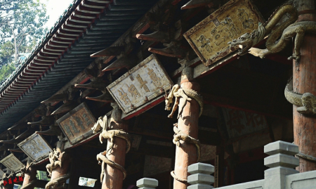 八條盤(pán)龍各抱定一根大柱,張口向前,怒目利爪,躍躍欲動(dòng),一派生氣。如今,雖近千年,木雕盤(pán)龍仍鱗片層層,須發(fā)根根,極其莊嚴(yán)威儀,難掩飛龍盤(pán)旋的氣勢(shì)。