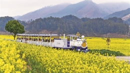 3月3日,在貴州省貴定縣盤江鎮(zhèn)“金海雪山”景區(qū),游客乘坐觀光小火車觀賞油菜花。