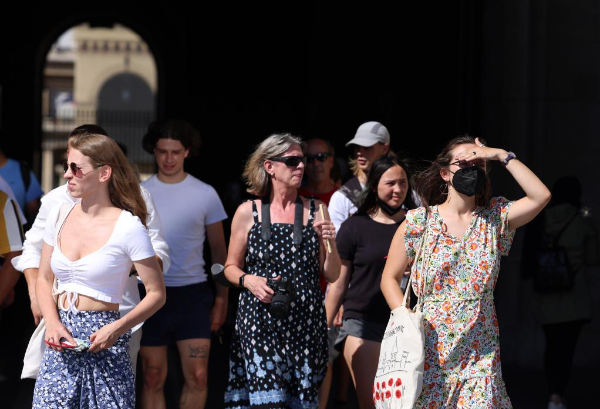2022年7月13日,人們走出法國巴黎盧浮宮博物館。新華社記者高靜攝??