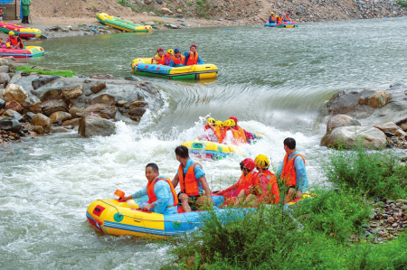 體驗完水上樂園后,張子良一行乘車來到位于中莊村的龐泉溝激情漂流。剛下車就看到了碼頭上熱鬧的景象,一艘艘漂流艇上坐滿了前來體驗的游客,大家穿著救生衣在工作人員的護送下向下漂流。偶爾遇到一處急流險灘,漂流艇隨著奔騰的水流飛馳而起,一眨眼的工夫就已落到了下一個平潭區(qū),游客們發(fā)出了陣陣尖叫。一路刺激,一路驚心,漂流給游客們留下了深刻的印象。負(fù)責(zé)該項目的閔玉貴介紹,項目選取了文峪河最精華的10公里河道,累計落差130米,平均水深0.8米,河道時寬時窄,水流時急時緩,沿途既有急流險灘,又有緩流碧潭,由于經(jīng)過了精心設(shè)計,且河道兩岸安排了上百名安全員護航,可以確保有驚無險。