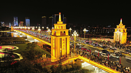 夜幕下新近改造的迎澤大橋宛如一條被紅色點(diǎn)亮的巨龍,橫臥在波光粼粼的汾河之上。金色的欄桿、飄動(dòng)的五星紅旗、耀眼的中華燈裝扮出濃濃的節(jié)日氛圍,從四面八方趕來(lái)的人們漫步橋上,頻頻舉起手機(jī)拍照留念。