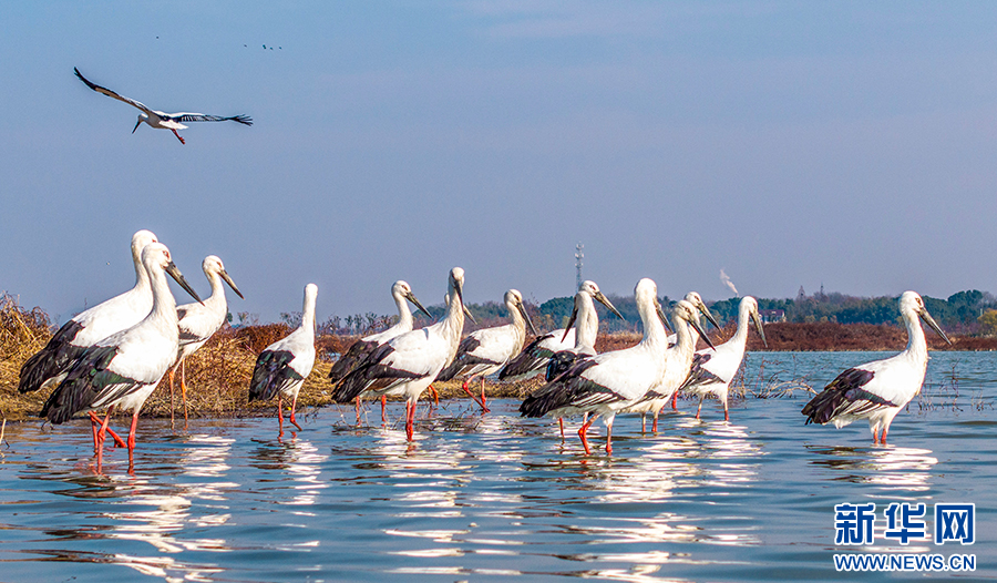 12月19日,安徽省合肥市廬江縣黃陂湖濕地,國家一級保護(hù)動物東方白鸛在此嬉戲、覓食,自由飛翔。