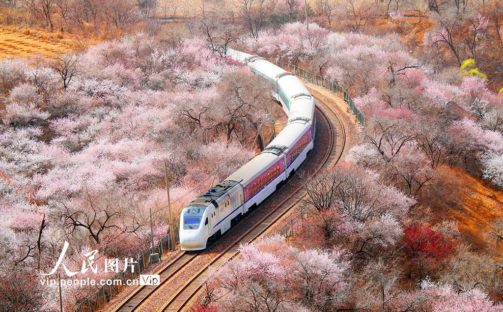 2025年3月23日,居庸關長城腳下繁花似錦,北京市郊鐵路S2線列車悠然穿行其間,該線列車因途經(jīng)多處風景名勝,被贊譽為“開往春天的列車”。張秀科攝(人民圖片網(wǎng))