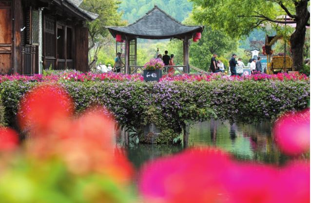 和順古鎮(zhèn)位于云南省騰沖市西南部,是云南省著名的僑鄉(xiāng),也是茶馬古道和西南絲綢之路重鎮(zhèn)。春日里,和順古鎮(zhèn)繁花盛開(kāi)、溪流潺潺,與灰瓦白墻的古樸建筑相映成趣,吸引眾多游客前來(lái)游玩。圖為4月19日,游客在和順古鎮(zhèn)游玩。