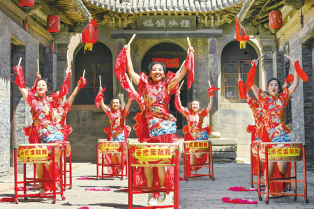 ②4月28日,太谷區(qū)文化館親疙蛋鼓舞隊隊員正在三多堂景區(qū)排練,為即將到來的“五一”假期展演做準備。