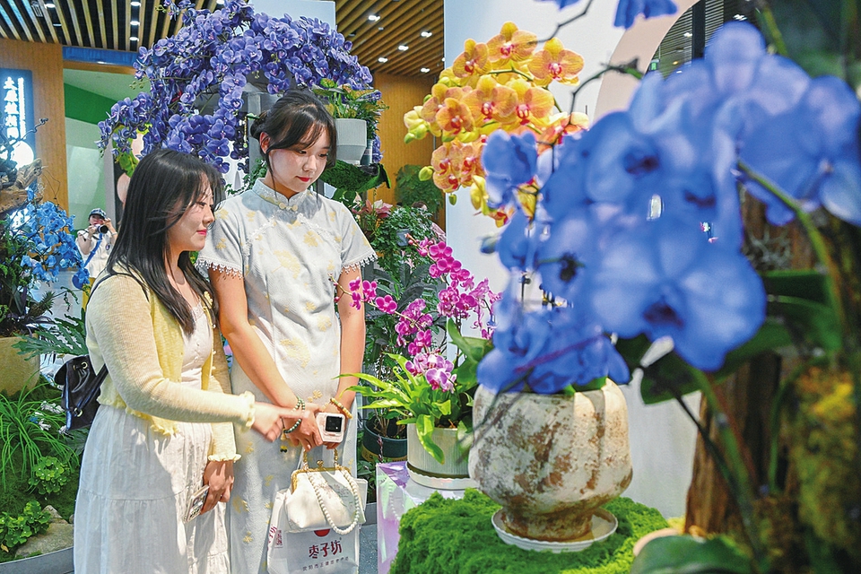 5月24日,游客在太原植物園觀賞蝴蝶蘭。為迎接端午節(jié)的到來,太原植物園舉辦“蝴蝶蘭展”,絢麗多彩的蝴蝶蘭配以中國元素的藝術(shù)化展示,讓游客在欣賞花卉獨特魅力的同時,感受傳統(tǒng)文化的豐富內(nèi)涵。