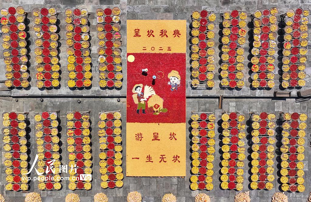 2025年8月18日,安徽省黃山市徽州區(qū)呈坎古村迎來了一年一度的“曬秋”盛景,村民們趁著晴好天氣,將豐收歸倉的玉米、南瓜、紅辣椒等農(nóng)作物鋪滿曬場(chǎng),五彩斑斕的農(nóng)作物與徽派古建交相輝映,構(gòu)成一幅五谷豐登的秋收畫卷,吸引眾多游客前來感受豐收的喜悅。施亞磊攝(人民圖片網(wǎng))