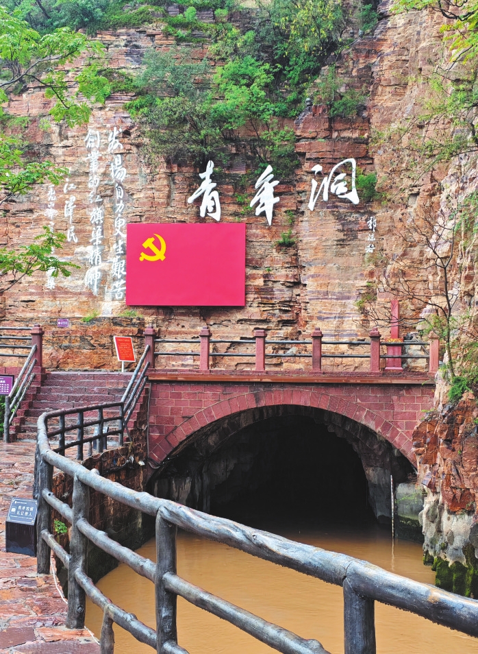 面對(duì)干旱缺水的生存困境,林縣人民以“一錘一釬一雙手”苦干十年,削平1250座山頭,鑿?fù)?11個(gè)隧道,在太行山間建成全長1500公里的水利工程,創(chuàng)造了開通“人工天河”的世界奇跡。青年洞是紅旗渠的咽喉所在,攀援在懸崖峭壁之上,縣里挑選了300名青年組成突擊隊(duì),晝夜施工,每人每天只有六兩糧。為了填飽肚子,他們上山挖野菜,下河撈水草充饑,以愚公移山精神挖山不止,經(jīng)過17個(gè)月的苦戰(zhàn),終于鑿?fù)?16米長的隧道。