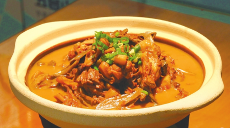 制作過程處處是講究,先泡發(fā)臺蘑、處理雞塊,用十幾種調(diào)料煸炒雞塊,再與泡發(fā)好的臺蘑小火慢燉40分鐘,讓山珍的鮮味與雞肉的醇香充分融合,最后大火收汁。這道菜將臺蘑鮮香與雞肉醇厚完美平衡,湯汁濃郁不膩。