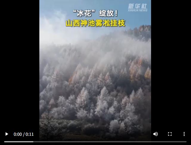 初冬時節(jié),山西神池國家登山步道出現霧凇景觀。金色的樹枝上掛滿冰晶,微風徐來,霧凇輕盈搖曳,還有牛羊在山坡上悠閑地吃草。霧凇宛如一層白色的薄紗,將整個森林籠罩其間,如夢如幻。