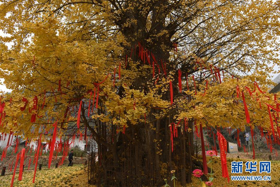 11月19日,游客在留壩縣玉皇廟鎮(zhèn)參觀(guān)千年銀杏樹(shù)。初冬時(shí)節(jié),在秦嶺深處的陜西省留壩縣玉皇廟鎮(zhèn)石窯壩村,一棵千年古銀杏樹(shù)的落葉宛如金色地毯,甚為壯觀(guān)。據(jù)當(dāng)?shù)亓謽I(yè)部門(mén)介紹,該樹(shù)胸徑為4.45米,現(xiàn)有高度29米。新華社記者 陶明 攝