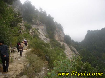 北武當(dāng)山主峰四周幾乎都是陡壁懸崖,只有一條人造“天梯”可攀。來(lái)到山腳下,過(guò)五里黃土、五里沙路,便是1400余級(jí)就山鑿筑的石階,凡險(xiǎn)峻之處,設(shè)有鐵索扶手。石階一線疊置,從下仰視,宛如“天梯”。游人攀登,每一步都可聽(tīng)到悠揚(yáng)頓挫的“石音”,形成獨(dú)特的“石樂(lè)”絕景。沿著石階,奇松異石、廟宇石刻,掩沒(méi)在蔥郁的山林植被之中,相間點(diǎn)綴,相映成趣。主要的山石景觀有:古猿望日、石豬受難、九龍出洞、石象守山、天壺傾露、石羊朝圣、石龜下蛋、石虎、石蛤蟆、龜蛇斗智等。最令人稱奇的是“龜蛇斗智”奇觀,相傳神龜和青蛇不安心修道,互相格斗,經(jīng)過(guò)七七四十九天的麈戰(zhàn),神龜節(jié)節(jié)敗退,青蛇步步緊逼。其時(shí),恰逢真武大帝返宮,見(jiàn)狀,輕輕用手指一點(diǎn),龜蛇便動(dòng)彈不得,從此永久停留在這里,成千古一絕——“蛇石”虎視眈眈,“龜石”尾臨懸崖,萬(wàn)斤重石,峭立崖畔,用力一推或經(jīng)風(fēng)一吹,便搖搖欲墜,令人心懸,所以又稱風(fēng)動(dòng)石,為我國(guó)罕見(jiàn)的景觀之一。主要的奇松景觀有:鴛鴦松、迎客松、托天松、母子松等。最使人嘆為觀止的是“擎天探海松”,其松立于石階半道,樹身技分兩杈,一直刺青天,一枝瞰群峰。近金頂?shù)悄咸扉T石階,旁邊陡崖上刻有“喬松”二字,據(jù)載為清代道光年間永寧州牧王繼賢手跡?,F(xiàn)存喬松樹樁直徑近1米,可以想見(jiàn)其昔日雄姿。主要的懸崖峭壁有:千仞壁、舍身崖、鷹嘴崖等。還有呈垂直分布的植被,其色彩和花期隨季節(jié)變化,給北武當(dāng)山披上了“春粉、夏艷、秋紅、冬白”的盛裝。登臨武當(dāng)之巔,一覽眾山,但見(jiàn)遠(yuǎn)山蒼茫,近日含黛,松風(fēng)撲面,白云飄逸;只聞松濤陣陣,山泉潺潺,鳥語(yǔ)唧唧,似琴弦輕撥;夏秋之季,如晴空萬(wàn)里,金頂之下,叢林景觀相間,似七彩織錦;白云遠(yuǎn)處,群山連綿,猶如萬(wàn)龍翻騰,極為壯觀。