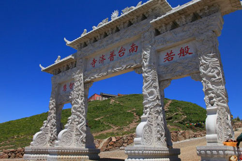 五臺(tái)山的南臺(tái)名喚錦繡峰,又名仙花山,海拔2485米。整個(gè)山勢(shì)像一匹駿馬靜臥群山之中。山峰聳峭,孤立挺拔,如果說其他四個(gè)臺(tái)是連襟而立或裙帶關(guān)系的話,南臺(tái)則是貌美如花、孤傲冷峻的公主?!肚鍥錾街尽访枋觯骸吧椒迓柷停瑹煿饽?,細(xì)草雜花,千巒彌布,猶鋪錦然,故以名焉”。山頂寺院叫普濟(jì)寺,內(nèi)供智慧文殊。